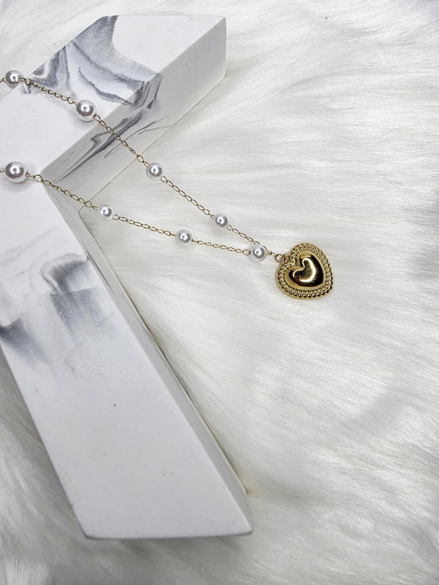 Beautiful white pearl necklace, heart pendant, gold color, in stainless steel, plated in 18K gold.