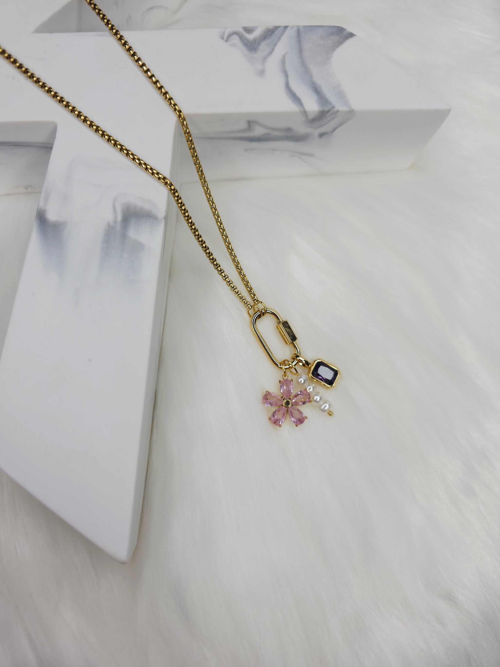 Retro and classic style pendant necklace featuring heart-shaped, shell, and floral patterns. Made of durable stainless steel with a 18K gold plating. Perfect for parties and special occasions."